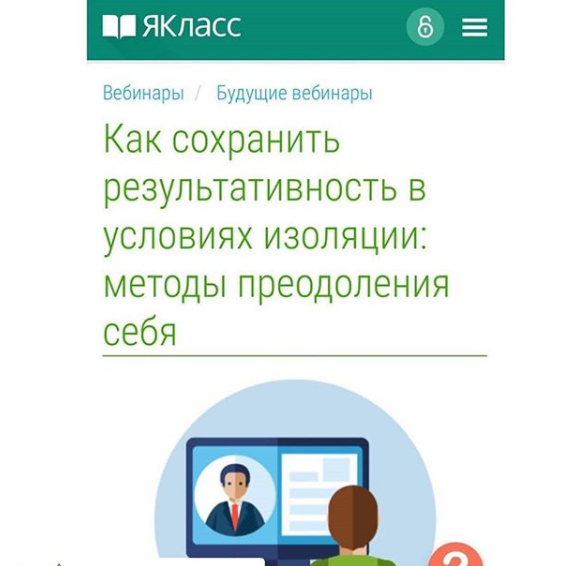 06.04.2020ВНИМАНИЕ! 8 апреля в 11:00 (МСК) компания ЯКласс проводит вебинар «Как сохранить результативность в условиях изоляции: методы преодоления себя».