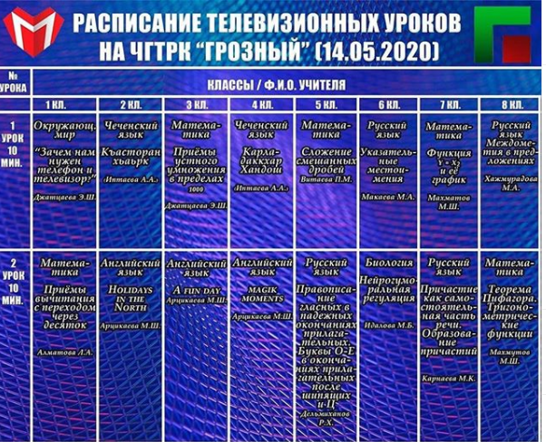 14.05.2020Уважаемые родители!Министерство образования и науки ЧР совместно с ЧГТРК «Грозный» продолжает реализацию проекта «Телешкола»Представляем Вашему вниманию расписание занятий на 14.05.2020.