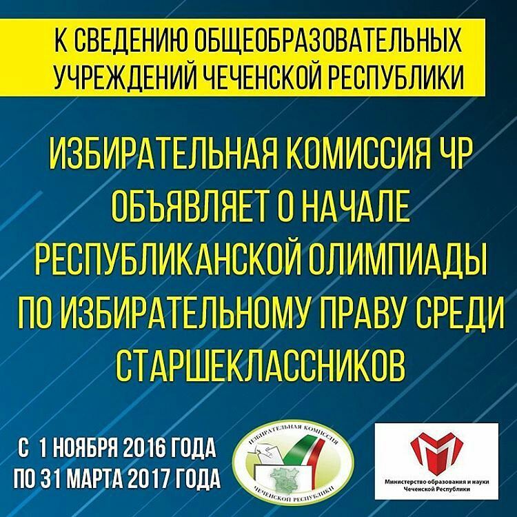 02.11.2016Избирательная комиссия Чеченской Республики сообщает о начале республиканской олимпиады по избирательному праву среди старшеклассников общеобразовательных учреждений Чеченской Республики.