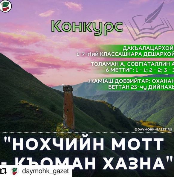 02.04.2021Хьомсара махкахой, лараме доттагӀий!Карарчу беттан 25-чохь билгалдоккхучу Нохчийн меттан денца а догӀуш, Нохчийн къоман "Даймохк" газето, НР-н къоман политикин а, арахьарчу зӀенийн а, зорбанан а, хаамийн а министерствоца (@mininform_chr) цхьаьна, 1-7-гӀий классашкарчу дешархошлахь дӀакхайкхайо "Нохчийн мотт - къоман хазна" аьлла конкурс.Цуьнан дакъалацархоша, "Даймохк" газетан агӀо а къастош, Instagram чохь зорбатоха еза нохчийн маттахь байт а йоьшуш, шаьш яьхна видеош.