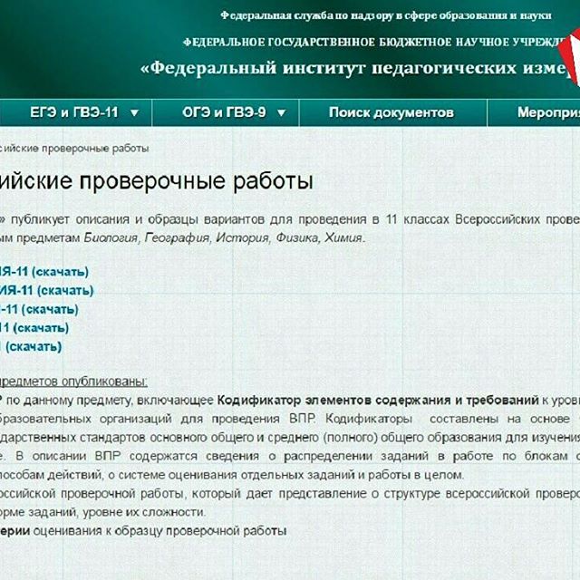 Федеральный институт педагогических измерений (ФИПИ) опубликовал образцы и описания Всероссийских проверочных работ (ВПР) для 11-х классов по биологии, географии, истории, химии и физике. ВПР в 11-х классах предназначены для итоговой оценки учебной подготовки выпускников, изучавших школьный курс данного предмета на базовом уровне. Содержание ВПР базируется на ФК ГОС среднего общего образования и по отдельным предметам частично включает материал основной школы (например, вопросы по географии России, вопросы из раздела «Человек и его здоровье» по биологии).Проекты образцов вариантов и описания ВПР для 11-х классов прошли экспертное обсуждение и получили положительные отзывы от ассоциаций учителей и преподавателей биологии, географии, истории, химии и физики. ВПР в 2017 году будут проведены для выпускников 11-х классов в режиме апробации. Согласно расписанию, утвержденному Рособрнадзором, они пройдут с 25 апреля по 18 мая 2017 года. Проведение ВПР организовано с целью формирования единого образовательного пространства в Российской Федерации. Варианты контрольных работ и система оценивания разрабатываются на федеральном уровне и должны дать возможность оценить учебные результаты школьников по единым критериям. Результаты ВПР не будут учитываться при выставлении годовых отметок по предметам или при получении аттестата о среднем общем образовании. Участие школ в проведении ВПР в 11 классе не является обязательным, такое решение будет принимать сама образовательная организация.