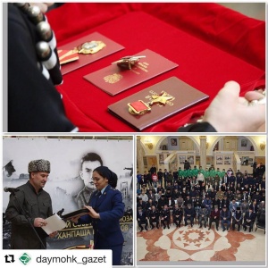 Государственные награды Героя Советского Союза Ханпаши Нурадилова переданы на хранение в Мемориальный комплекс Славы им. А.А. Кадырова Сегодня, 02.02.2017, благодаря содействию Главы республики Рамзана Кадырова в Мемориальном комплексе Славы им. А.А. Кадырова в торжественной обстановке на постоянное хранение переданы государственные награды медаль «Золотая Звезда» с книжкой Героя Советского Союза, орден Ленина и орден Красной Звезды участника Великой Отечественной войны Нурадилова Ханпаши Нурадиловича, уничтожившего 920 фашистов и геройски погибшего под Сталинградом в 1942 году.После смерти Ханпаши Нурадилова родственникам были переданы лишь муляжи его государственных наград. Решить проблему их получения не представилось возможным в советское и постсоветское время. Неоднократные обращения в различные государственные инстанции оставались без удовлетворения.У истоков решения этой исторической и нравственной проблемы стояли сотрудники прокуратуры республики, которые начали эту работу еще в 2014 году вместе с родственниками Героя Советского Союза.В ходе торжественной церемонии племянник Ханпаши Нурадилова Ислам Нурадилов высказал слова благодарности прокурору республики Шарпудди Абдул-Кадырову, председателю ветеранской организации прокуратуры Григорию Бисултанову, бывшему работнику прокуратуры республики Александру Паненкову и члену Общественной палаты Российской Федерации в прошлом исполнявшему обязанности прокурора республики Всеволоду Чернову за помощь в подготовке запросов и писем об оказании содействия в восстановлении исторической справедливости и передаче государственных наград на постоянное хранение в Мемориальный комплекс Славы им. А.А. Кадырова. Всем им на память от Регионального Общественного фонда имени Героя Советского Союза Ханпаши Нурадилова переданы фотопортреты с его изображением.Фотопортрет, подаренный прокурору республики, размещен в музее прокуратуры республики.