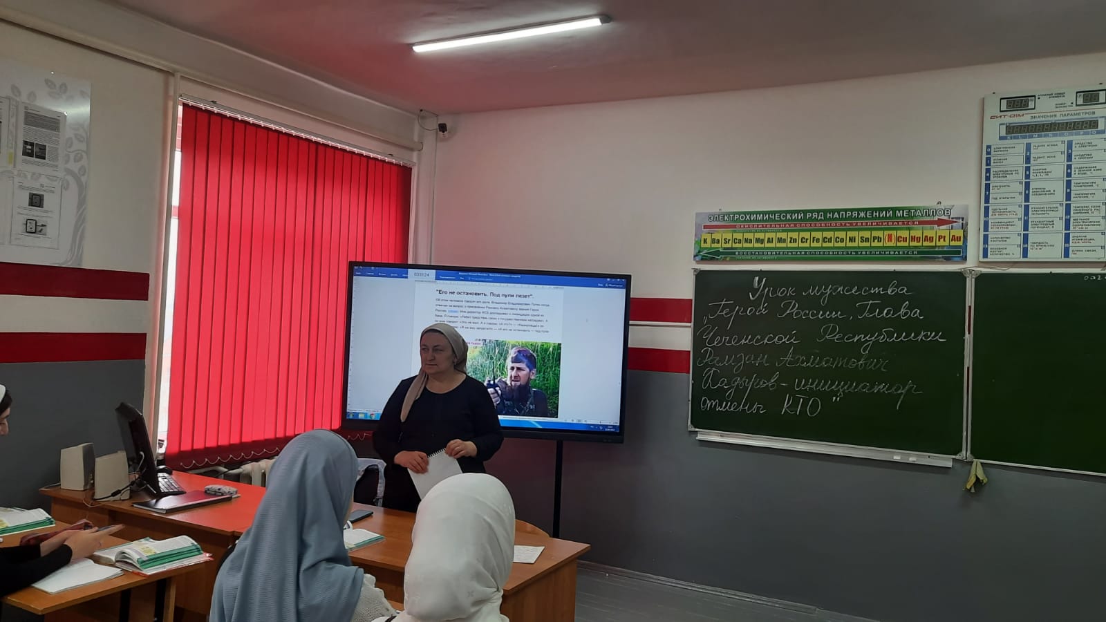 13.04.2022г. В МБОУ «СОШ №2 с.Алхан-Кала» учитель истории Басаева М. И. провела урок мужества «Герой России, Глава Чеченской Республики Р. А. Кадыров-инициатор отмены КТО».