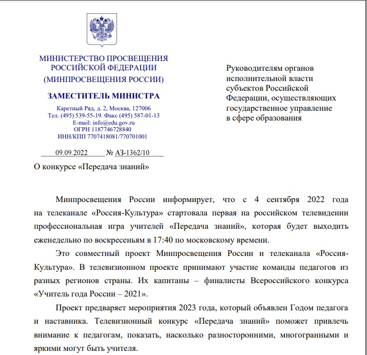 10.09.2022Минпросвещения России информирует, что с 4 сентября 2022 года на телеканале «Россия-Культура» стартовала первая на российском телевидении профессиональная игра учителей «Передача знаний», которая будет выходить еженедельно по воскресеньям в 17:40 по московскому времени. Это совместный проект Минпросвещения России и телеканала «РоссияКультура». В телевизионном проекте принимают участие команды педагогов из разных регионов страны. Их капитаны – финалисты Всероссийского конкурса «Учитель года России – 2021». Проект предваряет мероприятия 2023 года, который объявлен Годом педагога и наставника. Телевизионный конкурс «Передача знаний» поможет привлечь внимание к педагогам, показать, насколько разносторонними, многогранными и яркими могут быть учителя.