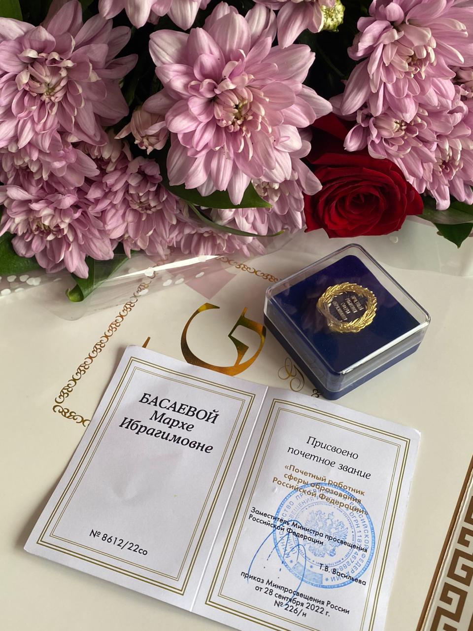ПОЧЕТНЫМ ЗВАНИЕМ «ПОЧЕТНЫЙ РАБОТНИК СФЕРЫ ОБРАЗОВАНИЯ РОССИЙСКОЙ ФЕДЕРАЦИИ» удостоена наша БАСАЕВА МАРХА ИБРАГИМОВНА, учитель истории и обществознания МБОУ «СОШ N°2 с.Алхан-Кала»!!!
