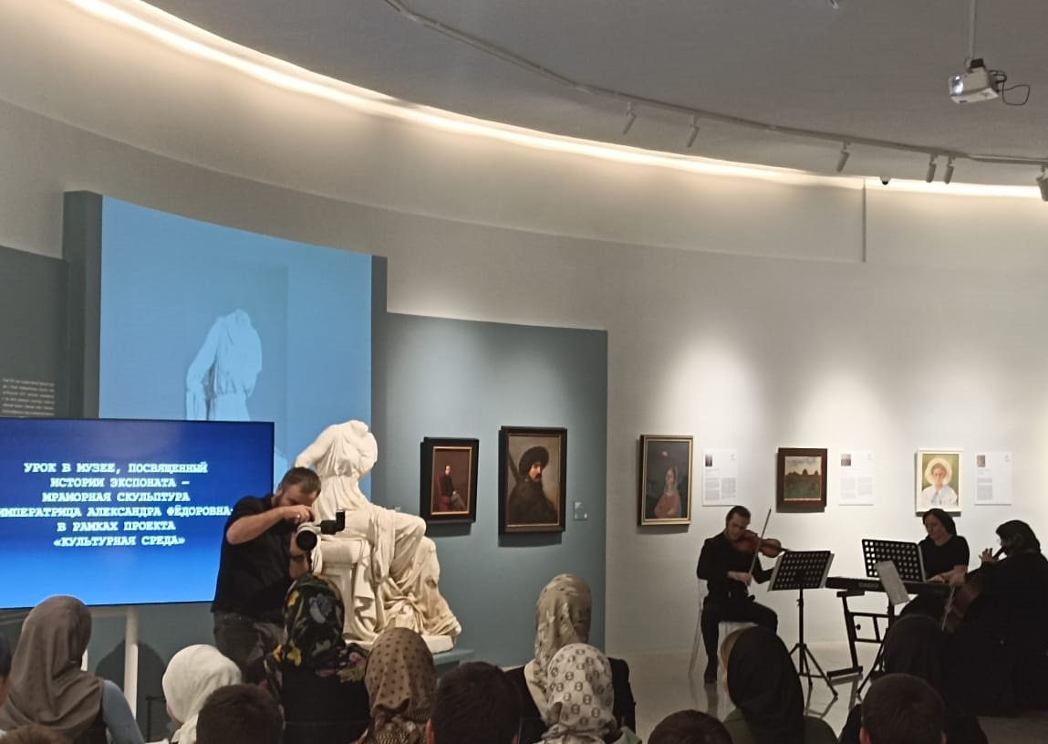 Национальный Музей ЧР запустил новый цикл уроков, в рамках проекта «Культурная среда». «Урок в музее» на этот раз был посвящен истории мраморной скульптуры «Императрица Александра Федоровна». Уникальную и витиеватую историю экспоната музея юные слушатели узнали из рассказа ведущего и медиа-материалов. О судьбе же Александры Федоровны поведала от первого лица актриса в образе императрицы. Уникальной атмосферы представлению добавило музыкальное сопровождение Государственного симфонического оркестра Чеченской Республики.