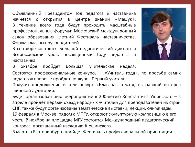 20.03.20232023 год Указом Президента России Владимира Путина объявлен Годом педагога и наставника. Миссия Года – признание особого статуса педагогических работников, в том числе выполняющих наставническую деятельность. Мероприятия Года педагога и наставника будут направлены на повышение престижа профессии учителя.