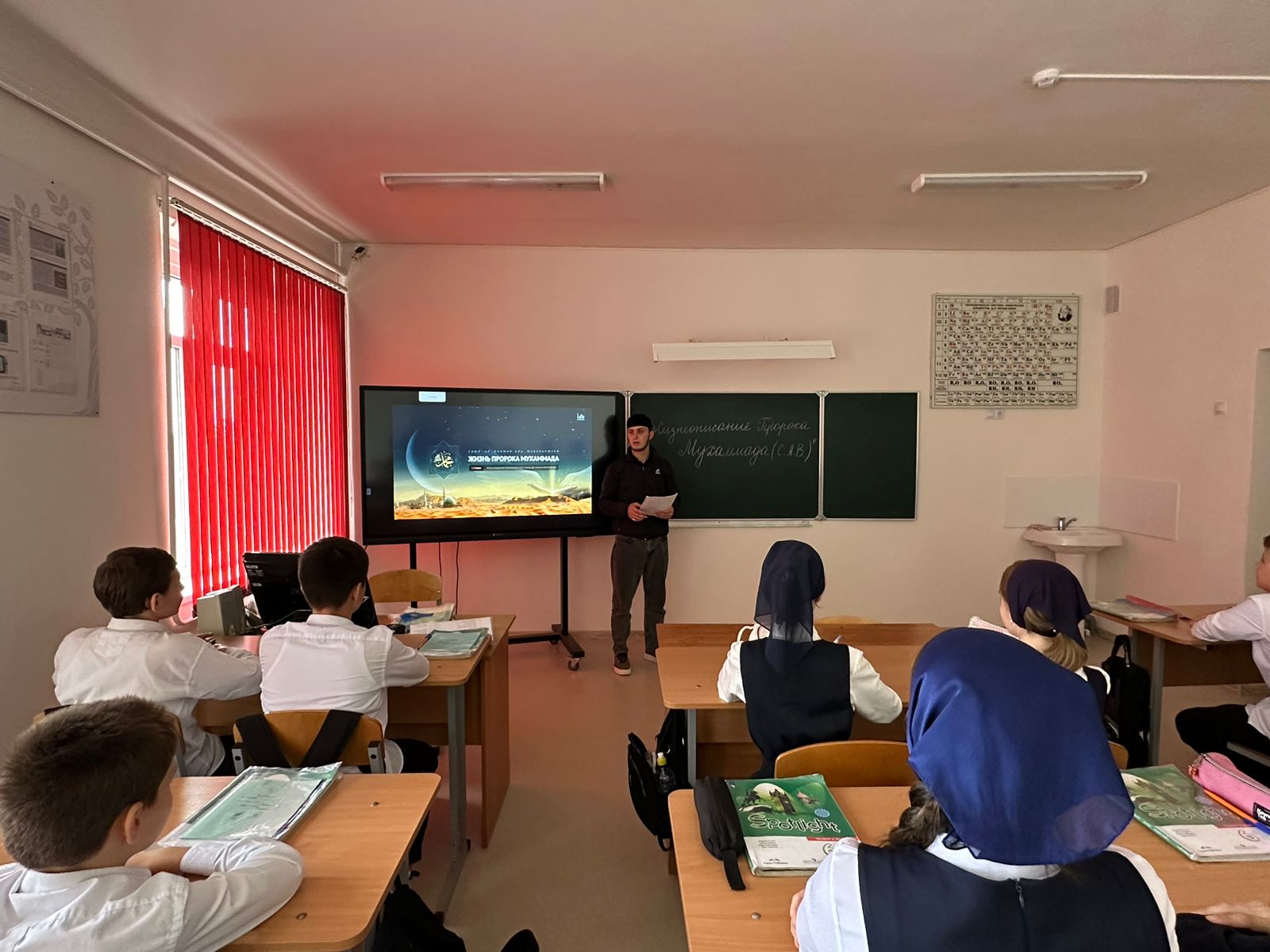 4 октября 2023 года педагогом по ДНВ Р.З.Хагиевым проведена лекция на тему: были проведены беседы на тему: «Жизнь и деятельность Пророка Мухаммада (с.а.с.)», «Все о любимом Пророке» (да благословит его Аллах и приветствует). Он рассказал о значимости этого дня для всего мира, в истории человечества.