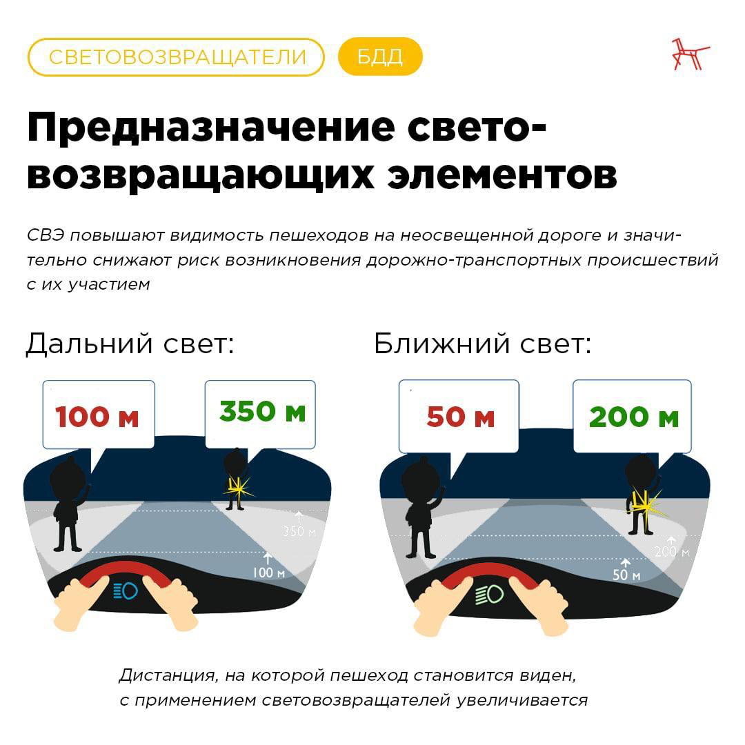 При движении автомобиля с дальним светом фар дистанция, на которой пешеход становится виден, с применением световозвращателей увеличивается со 100 метров до 350 метров. Это даёт водителю 15-25 секунд для принятия решения.