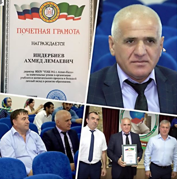 На ежегодной августовской конференции работников образования Грозненского муниципального района директор МБОУ" СОШ 2 с. Алхан-Кала" Индербиев Ахмед Лёмаевич награждён почетной грамотой Главы администрации Грозненского муниципального района Бекхана Султановича Хасиева , за значительные успехи в организации учебного и воспитательного процесса и большой личный вклад в развитие образования.