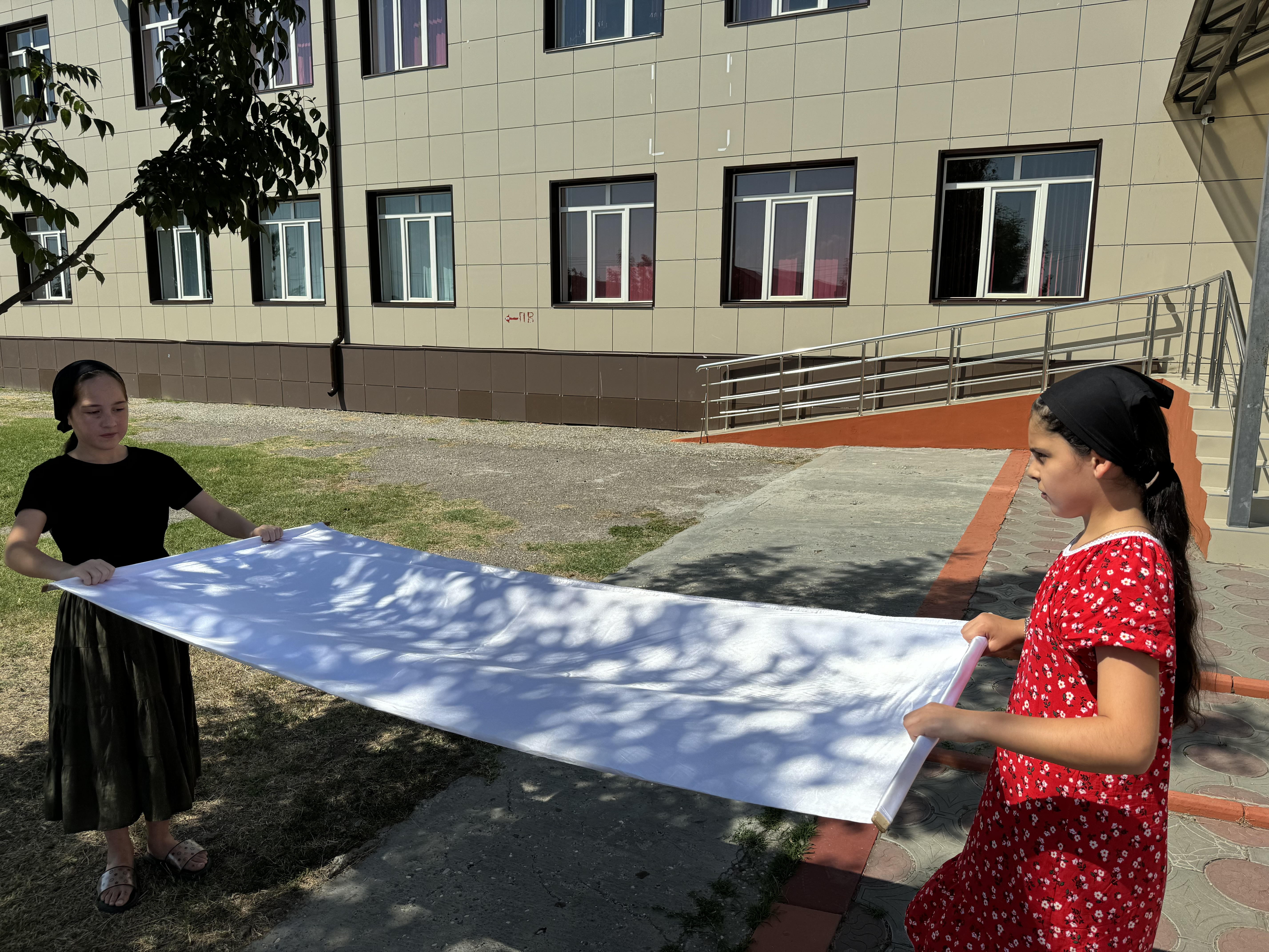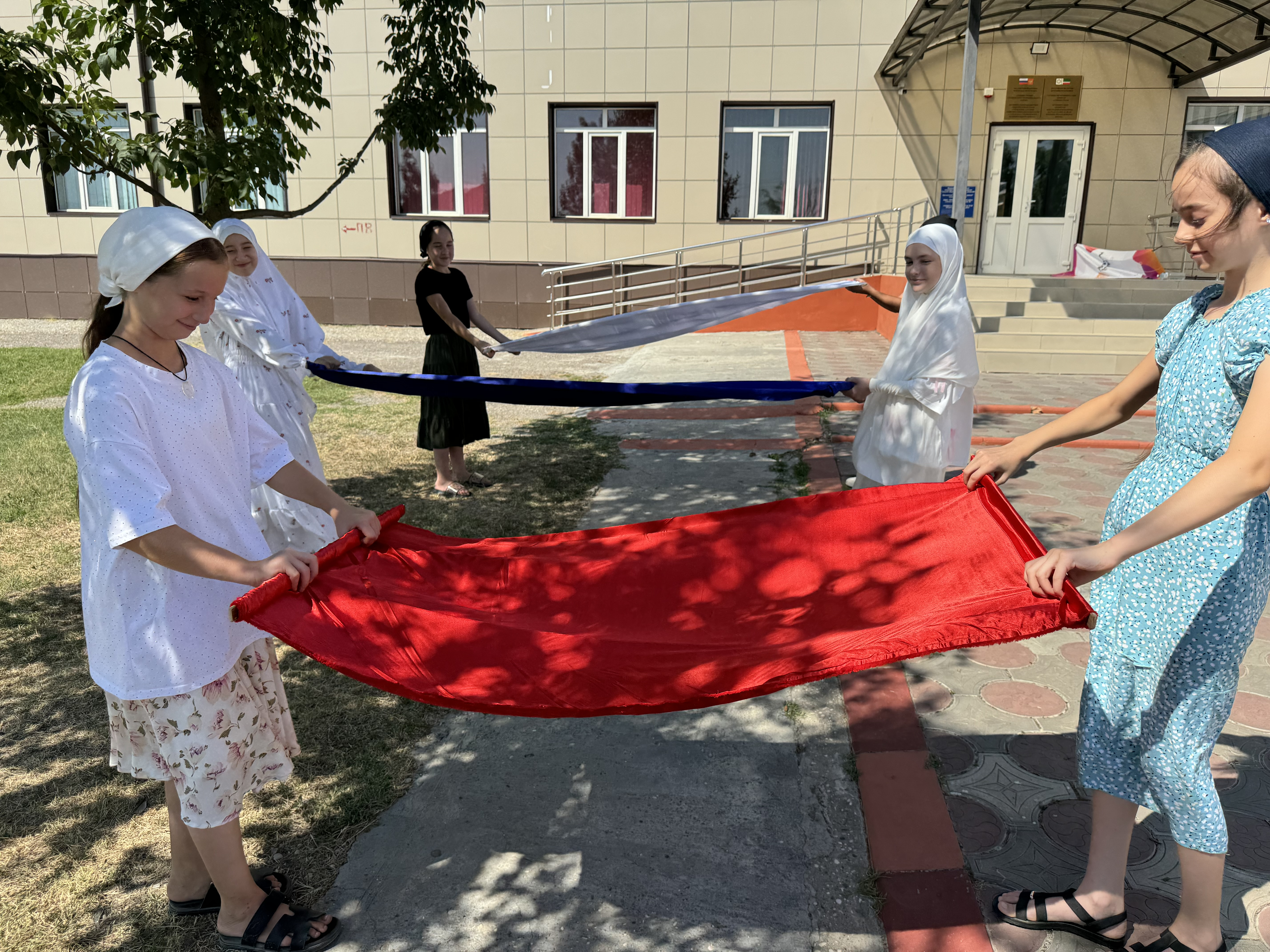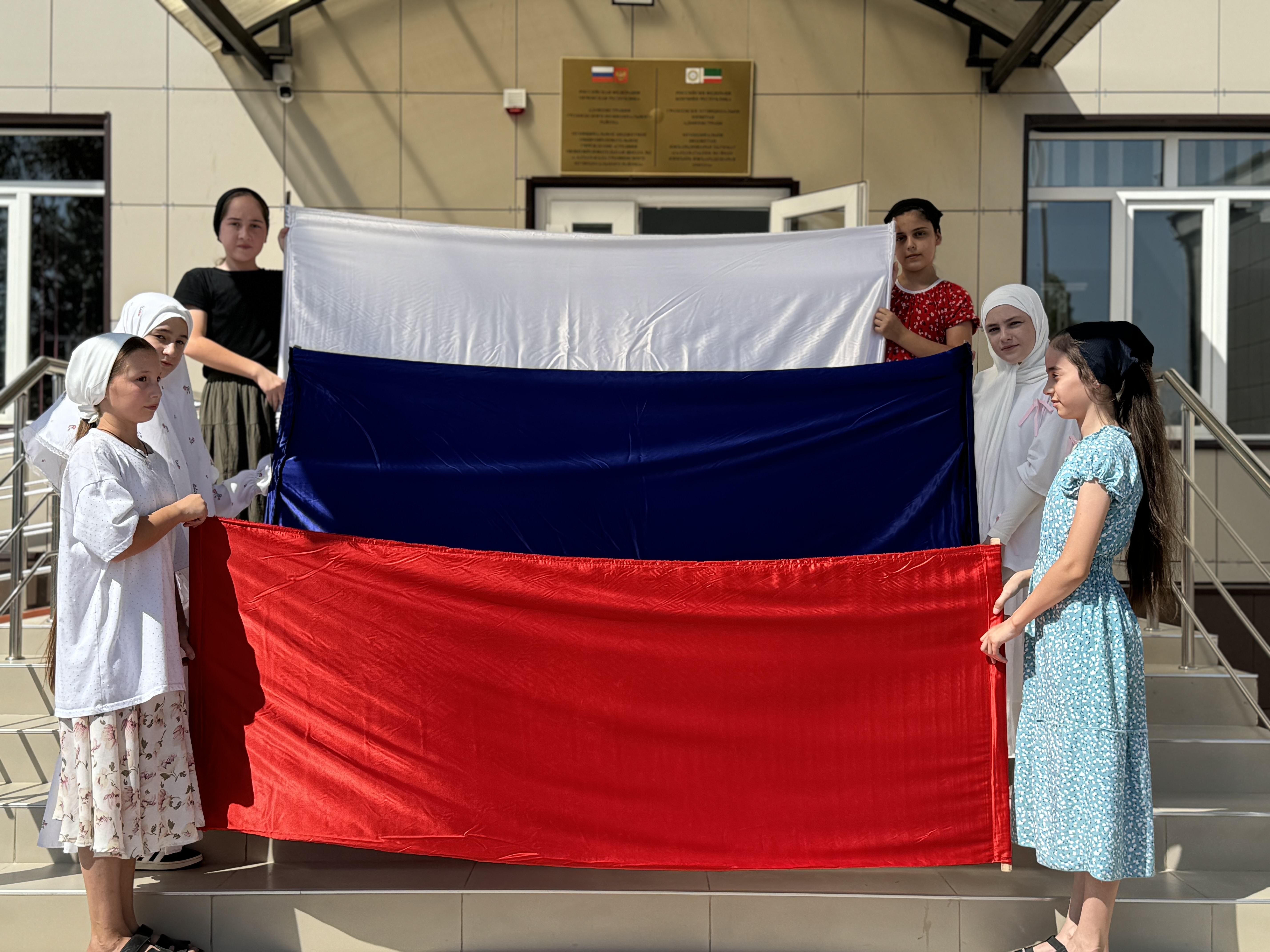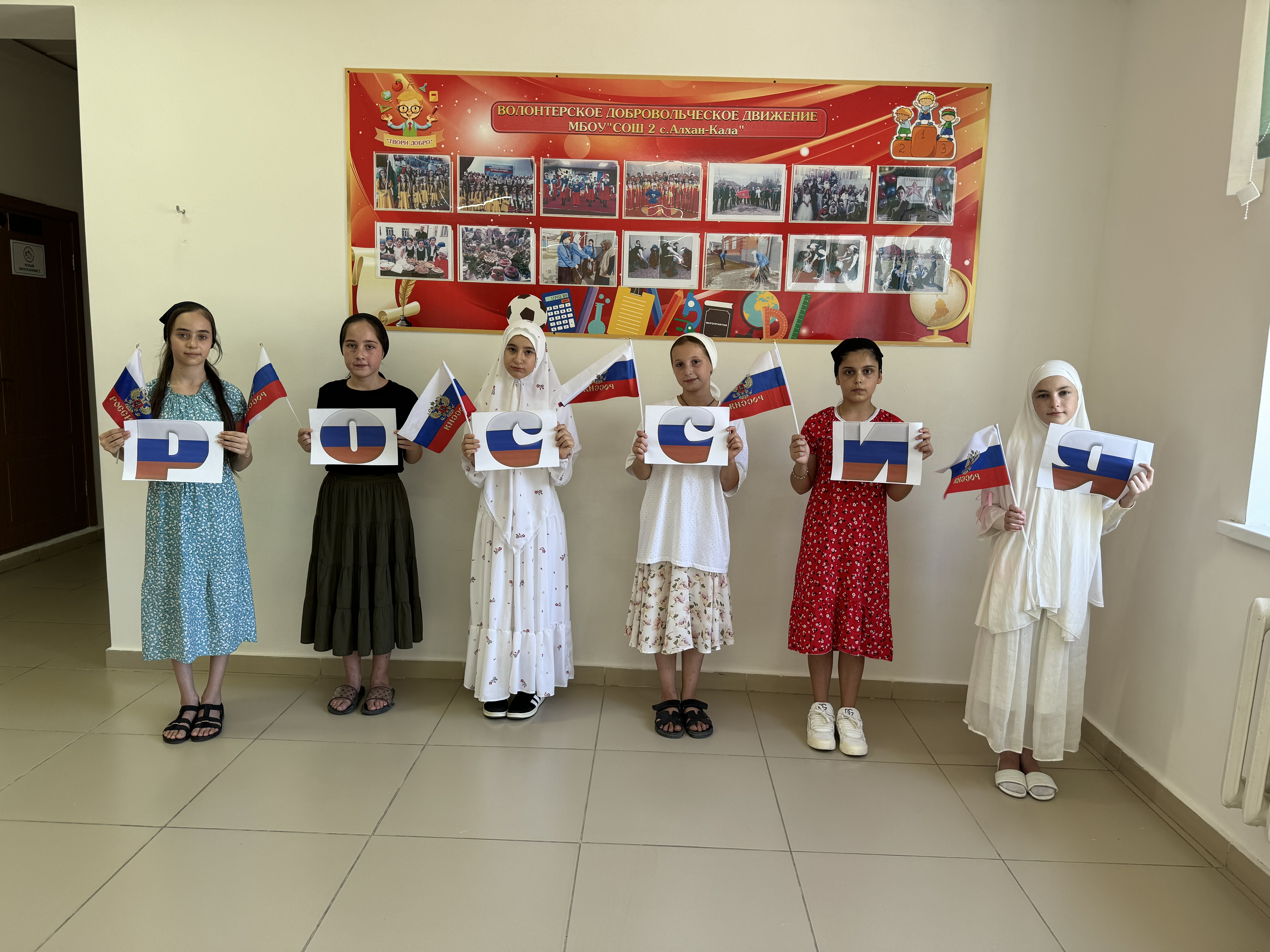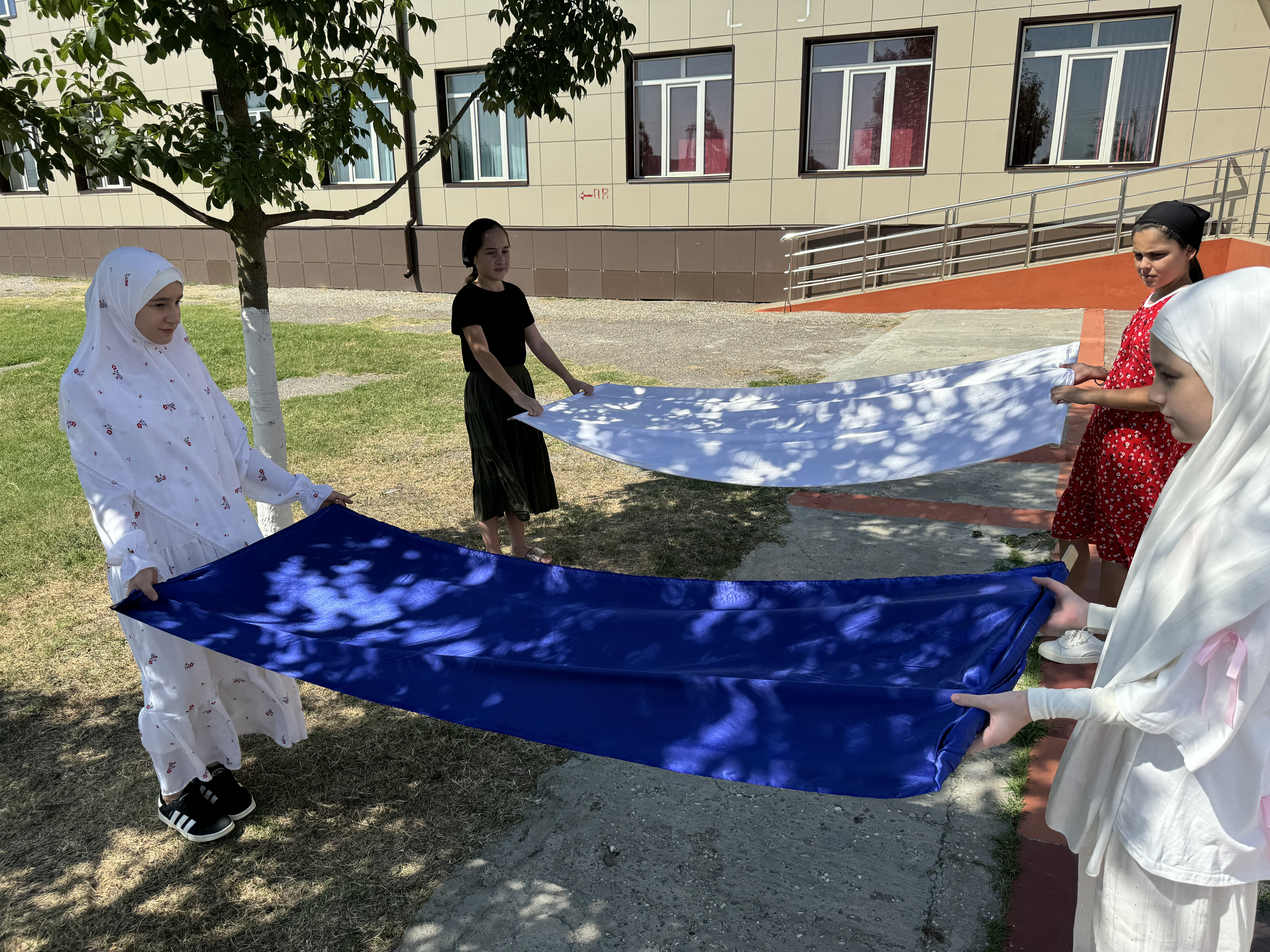 В преддверии празднования Дня государственного флага РФ советник директора по воспитанию МБОУ "СОШ №2 с. Алхан-Кала" П.Т. Юсупова организовала акцию "Живой флаг".