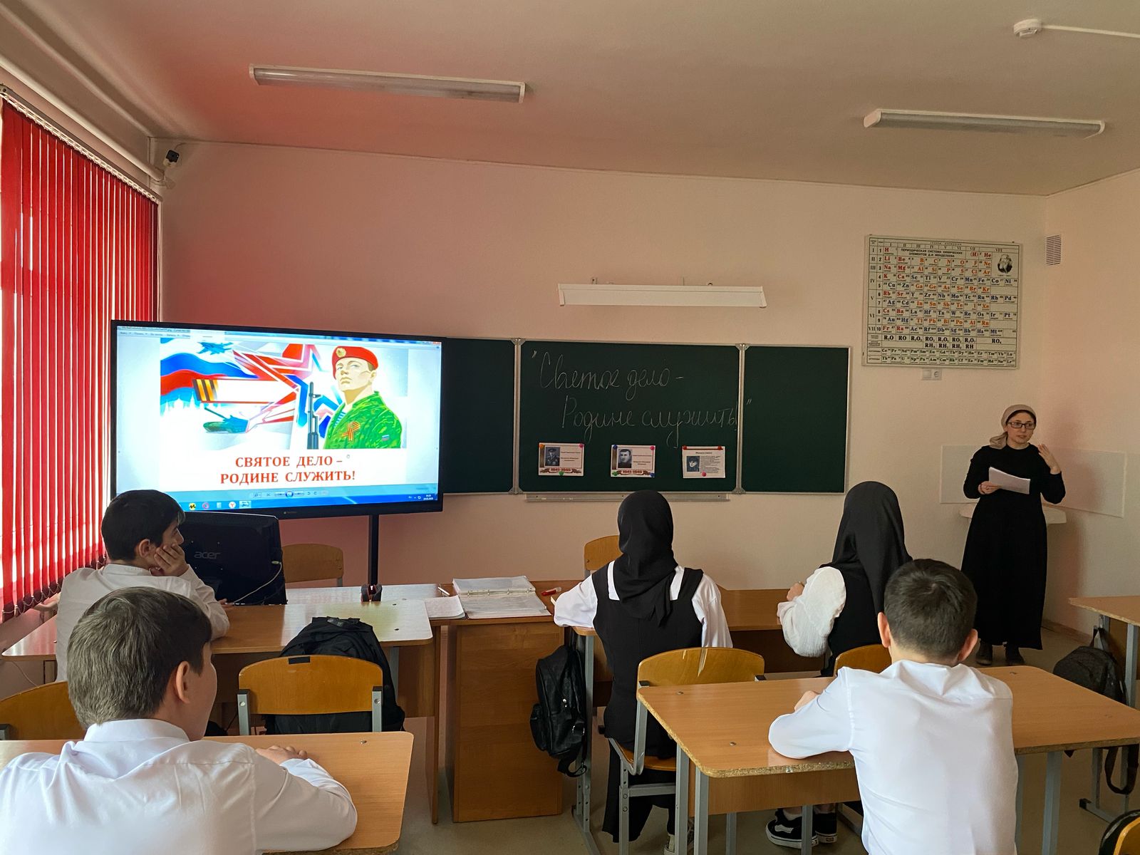 В преддверии Дня защитника Отечества в МБОУ "СОШ №2 с.Алхан-Кала Грозненского муниципального района ЧР" прошел патриотический час: «Святое дело - Родине служить». Ребята познакомились с историей создания армии, её боевым прошлым, с положением армии сегодня. Вспомнили имена героев Великой Отечественной войны. В ходе мероприятия ребята прочли стихи, посвящённые этой дате.