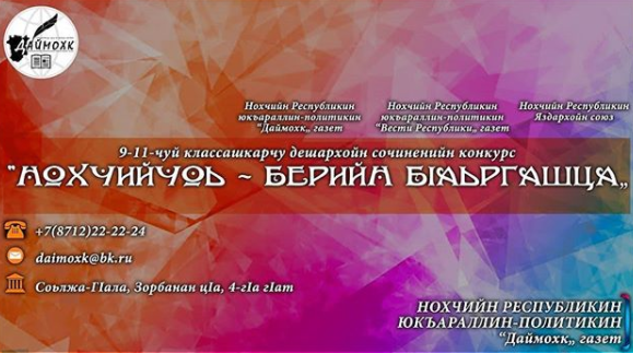 13.02.2018Нохчийн Республикин юкъараллин-политикин "Даймохк" газето а, Нохчийн Республикин Яздархойн союзо а, Нохчийн Республикин юкъараллин-политикин "Вести Республики" газето а дӏакхайкхайо "Нохчийчоь - берийн бӏаьргашца" аьлла йолчу сочиненийн конкурс