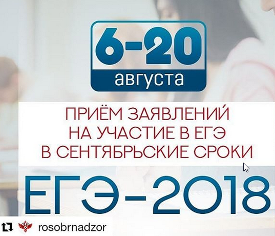 09.10.2018Приём заявлений на участие в ЕГЭ в сентябрьские сроки пройдёт с 6 по 20 августа включительно. Заявления подаются в места регистрации, определяемые региональными органами управления образованием.Экзамены в сентябрьские сроки будут проведены по двум обязательным для выпускников предметам – математике базового уровня и русскому языку:4 сентября – русский язык;7 сентября – математика базового уровня;15 сентября – русский язык и математика базового уровня.Принять участие в ЕГЭ в сентябре имеют право обучающиеся, не прошедшие государственную итоговую аттестацию после 11 класса, либо получившие неудовлетворительный результат по одному или обоим обязательным