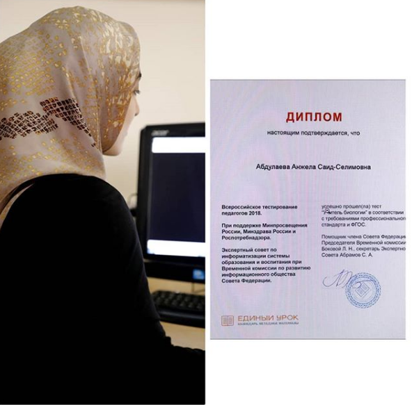 Анжела Абдулаева успешно прошла тест "Учитель биологии" в соответствии с требованиями профессионалньного стандарта и ФГОС на сайте "Единый урок", который проводит комиссия Совета Федерации по развитию информационного общества . Мероприятие направлено на установление уровня знаний учителей и руководящих работников общеобразовательных организаций.